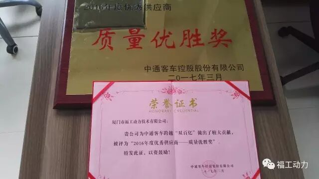 就在前段时间,福工在中通百余家供应商中脱颖而出,成为了中通客车2016年度优秀供应商并获得了质量优胜奖这一殊荣。